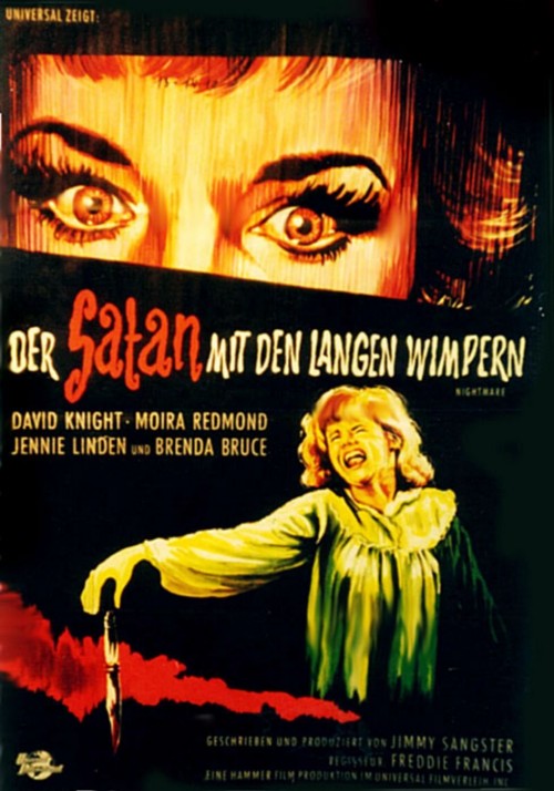 Die junge Janet (Jennie Linden) kehrt aus einem Mädcheninternat zurück in das düstere Haus ihrer Kindheit und wird dort von grässlichen Alpträumen geplagt. Als Kind musste sie mitansehen, wie ihre Mutter den Vater ermordete und daraufhin in eine Nervenheilanstalt (sprich: eine Gummizelle) eingewiesen wurde. In der Nacht kommen die Alpträume, in denen Janet die Ereignisse erneut durchlebt. Will da jemand das zarte Mädel in den Wahnsinn treiben? Etwa die freundliche Krankenschwester (Moira Redmond), die vom netten Onkel (David Knight) eingestellt wurde? Oder beide zusammen? Wer weiß... Die britischen Hammer-Studios versuchten sich in den 60ern neben den klassischen Kostüm-Horror-Stoffen wie »Dracula« und »Frankenstein« auch an zeitgenössischen Horror- und Psychothrillern im Stil von Hitchcocks »Psycho« und Clouzots »Die Teuflischen«. Der weniger bekannte »Nightmare - der Satan mit den langen Wimpern« aus dem Jahr 1964 gehört neben Seth Holts »Ein Toter spielt Klavier« zu den Besten seiner Art. Das Drehbuch stammt wie so oft von Jimmy Sangster, der eine falsche Fährte nach der anderen legt. Niemandem in diesem Schauerstück ist zu trauen, alle spielen ein doppeltes Spiel, und nach der halben Laufzeit beendet er zunächst seine Geschichte, um dann noch einmal komplett neu anzufangen. Freddie Francis, der ein noch begnadeterer Kameramann als ein Regisseur war (er fotografierte »Schloss des Schreckens«), taucht das Spektakel in frostige Atmosphäre und schaurig-düstere Bilder aus dem winterlichen England. Jennie Linden ist als Hauptfigur etwas zu schwach und hilflos geraten, um wirklich mit ihr mitfiebern zu können, das fröhliche Rätselraten um die wahren Täter und Hintergründe aber hält den Film am Laufen. Die Rolle der Janet sollte ursprünglich mit der jungen Julie Christie besetzt werden. Als diese kurzfristig die Hauptrolle in John Schlesingers »Geliebter Spinner« angeboten bekam sagte sie ab. Nach einigem Zögern entließ Hammer Christie von ihrem Vertrag. Sangster und Francis entdeckten kurz vor Produktionsbeginn während einer Theateraufführung in Worthing die damals 23-jährige Jennie Linden, die mit ihrer Rolle als Janet in »Der Satan mit den langen Wimpern« ihr Filmdebüt gab. Die erste Klappe zu »Der Satan mit den langen Wimpern« viel am 17. Dezember 1962. Die Dreharbeiten dauerten insgesamt sechs Wochen. Ursprünglich sollte der Film »Here's a Knife Dear - Now use it« heißen. Jimmy Sangster war gegen diesen Titel. In einem Interview mit dem Cinematograph Weekley von 3. Januar 1963: »Das Problem mit diesem Titel ist, dass er zu viel verrät – nämlich alles.« Vorteilhaft für den Film war der strenge Winter 1962/63 durch den sich die seltene Gelegenheit ergab Szenen mit echtem Schnee zu drehen, was die »Kälte« der Films zusätzlich unterstreicht. Fazit: Auch wenn »Nightmare« nicht die Klasse von »Ein Toter spielt Klavier« erreicht, spielt er doch in derselben Liga, und wer schwarzweißen Psycho-Grusel ebenso gerne verschlingt wie ich, wird hier sicher seine Freude haben.